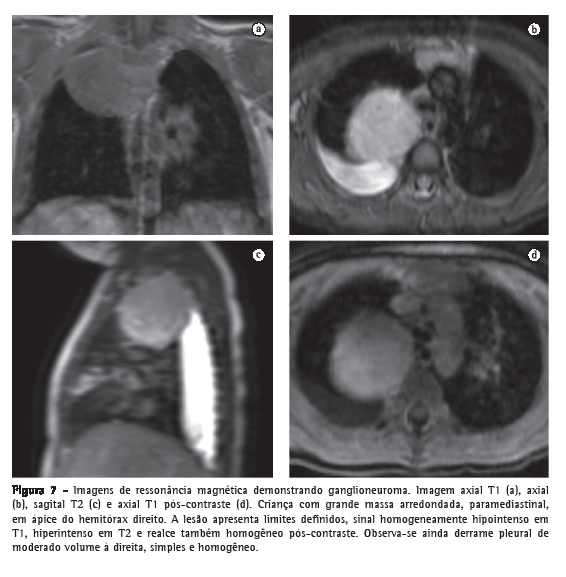 Os tumores neurogênicos são encontrados mais comumente no mediastino posterior, na região paravertebral, e muitas vezes identifica-se sua relação com o forame neural (Figura 7). As lesões podem ser originárias do nervo periférico, benignas (neurofibroma e schwannoma) ou malignas (neurofibrossarcoma), ou do gânglio simpático (ganglioneuroma, ganglioneuroblastoma e neuroblastoma). As lesões benignas são mais comumente caracterizadas como massas esféricas ou lobuladas, com alto sinal T2, reforço intenso pós-contraste e com aspecto homogêneo, com exceção do neuroblastoma, que pode ser mais heterogêneo, inclusive com calcificações. Já as lesões malignas tendem a ser maiores, mais irregulares, mais heterogêneas e com sinais de invasão da medula e da coluna torácica.(57)