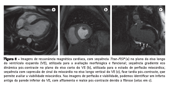 Nos últimos anos, a RM cardíaca evoluiu de uma ferramenta de pesquisa científica para um método de imagem com aplicação clínica que é seguro, eficaz e com boa relação custo-benefício. A RM cardíaca pode ser realizada em diferentes modalidades de acordo com a indicação clínica, incluindo estudos morfológicos, funcionais, perfusionais e de viabilidade miocárdica. O método fornece detalhes anatômicos nas cardiopatias congênitas, na pesquisa da displasia arritmogênica do ventrículo direito e na avaliação de massas cardíacas, diferenciando, por exemplo, trombos de lesões neoplásicas. É o método mais preciso para a quantificação de massa, volume e função dos ventrículos direito e esquerdo. Devido a sua excelente reprodutibilidade, a RM é ótima na avaliação da resposta terapêutica sobre a função ventricular. A perfusão miocárdica com a primeira passagem do meio de contraste paramagnético se tornou uma alternativa eficiente à cintilografia na detecção de doença aterosclerótica coronariana, podendo ser realizada em repouso ou utilizando o estresse farmacológico. As imagens de realce tardio pós-contraste são utilizadas para a identificação de áreas de fibrose em miocárdio inviável após o infarto (Figura 8), sendo também um método robusto no estudo de outras miocardiopatias não isquêmicas, tais como miocardiopatia dilatada, miocardiopatia hipertrófica, sarcoidose e miocardite.(59)