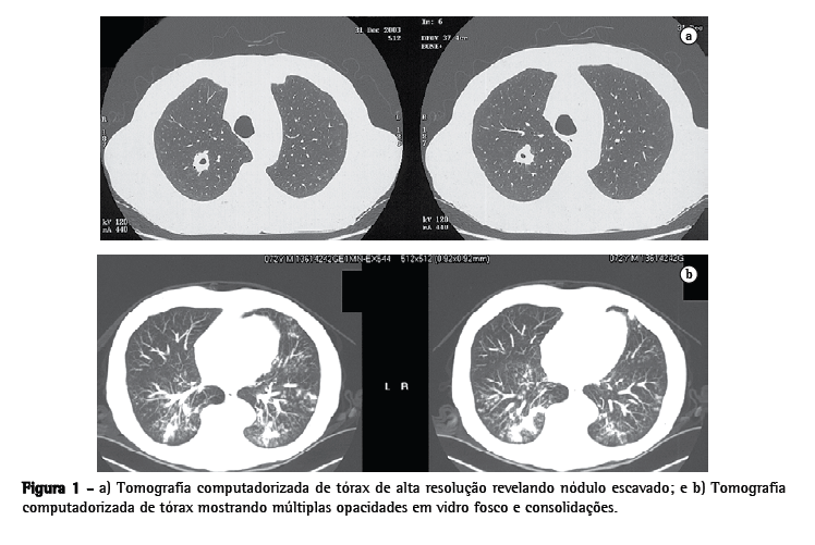 Discussão Este foi o primeiro relato de caso no qual foi observada a combinação de nódulo escavado, opacidades em vidro fosco e consolidações pulmonares numa TCAR (Figura 1). Este achado é importante porque inclui a SAM no diagnóstico tomográfico diferencial de pneumonia, linfoma, vasculite pulmonar, hemorragia alveolar, tuberculose, pneumocistose, nocardiose e doença fúngica.(5-9)