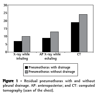 In this study, the incidence of residual pneumothorax in the two groups, with and without postoperative pleural drainage, was the same, whether diagnosed on tomography scans or on X-rays (while inhaling or while exhaling).