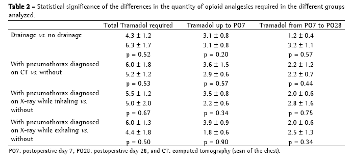 The quantity of opioid analgesics required (oral tramadol hydrochloride, 50 mg) ranged from 0-33 pills (mean 5.41 ± 1.05 pills) up to day 28, to 0-18 pills (mean 3.12 ± 0.62) up to day 7 to 0-23 pills (mean 2.26 ± 0.67) between days 8 and 28, with no difference between the groups that had received drainage or not, or between the groups with or without residual pneumothorax, diagnosed through tomography, or on X-rays taken while inhaling or exhaling (Table 2).