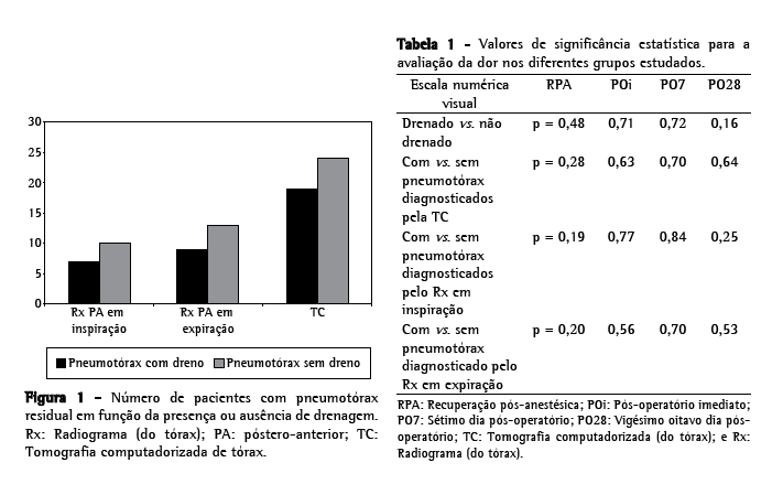 Em nenhum momento houve diferença quanto à intensidade da dor entre os pacientes drenados e não drenados, nos períodos RPA, pós-operatório imediato, 7º e 28º dias, ou entre aqueles com pneumotórax residual e com reexpansão completa diagnosticados na tomografia, nos radiogramas em inspiração ou em expiração (Tabela 1).