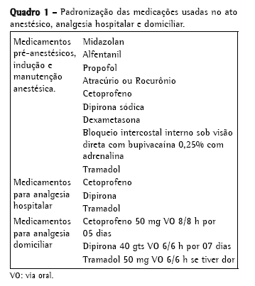A analgesia domiciliar pós-operatória (Quadro 1) foi padronizada e o requerimento de analgésicos opióides controlado até o 28º dia de pós-operatório.