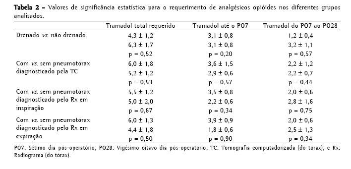 O requerimento de analgésico opióide (cloridrato de tramadol 50 mg, oral) até o 28º dia variou de zero a 33 comprimidos (média 5,41 ± 1,05); até 7 dias, de zero a 18 comprimidos (média de 3,12 ± 0,62); e do 8º até o 28º dia de zero a 23 comprimidos (média de 2,26 ± 0,67), sem diferença entre os grupos drenados e não drenados ou entre os grupos com presença ou não de pneumotórax residual diagnosticado tanto à tomografia, no radiograma em inspiração ou em expiração (Tabela 2).