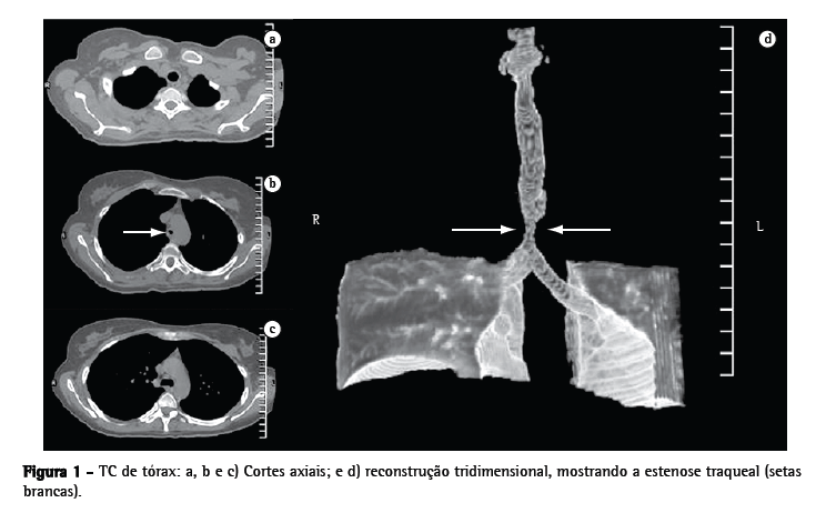 Ao exame físico apresentava estridor, além de roncos difusos. O radiograma de tórax evidenciava diminuição significativa da coluna aérea na topografia da traquéia distal. A tomografia computadorizada (TC) do tórax com reconstrução tridimensional (Figura 1) evidenciou estenose da traquéia distal (com extensão de 15 mm) 20 mm acima da carina traqueal.