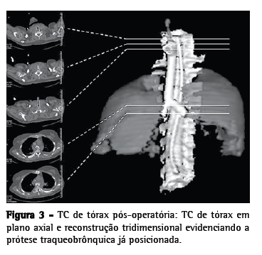 Uma semana após a inserção da prótese, a paciente foi submetida à broncoscopia flexível e TC de controle (Figura 3), as quais permitiram verificar o perfeito posicionamento da prótese. A paciente recebeu alta hospitalar no 10º dia após a inserção da prótese traqueal.