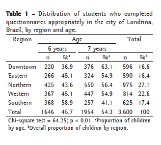 Based on the proportional distribution of children between 6 and 7 years of age by region and on the number of public schools in the city of Londrina, Brazil, 3,963 questionnaires were sent. Of those, 3,600 (90.8%) were appropriately completed, thereby comprising the database. Of the sample as a whole, 45.7% of the students were 6 years old and 54.3% were 7 years old.
