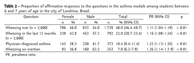 In the present study, as in the study conducted in Curitiba,(19) the prevalence of asthma was determined by the criteria set for "probable asthma": four or more attacks in the last 12 months; or one to three attacks associated with sleep disruption; or even one to three attacks without sleep disruption, but accompanied by nocturnal cough and symptoms on exertion. The prevalence of probable asthma was found to be 16.5% among students between 6 and 7 years of age in the city of Londrina, Brazil, being higher in boys than in girls. This result is similar to the rate of 15.7% reported in the study conducted in the city of Curitiba, Brazil,(19) and higher than the 13.2% reported in the study conducted in the city of Cuiabá, Brazil.(18)