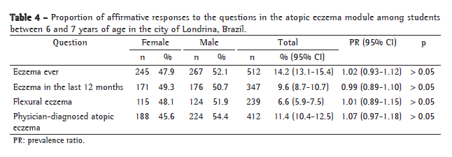 Worldwide, the prevalence of physician-diagnosed atopic eczema ranged from 1.1% in Iran to 18.4% in Sweden.(27) In Brazil, it ranged from 7.9% in the city of Santo André to 15.2% in the city of Manaus.(28) In the city of Londrina, the rate of 11.6% found for the prevalence of physician-diagnosed atopic eczema is within the national average.