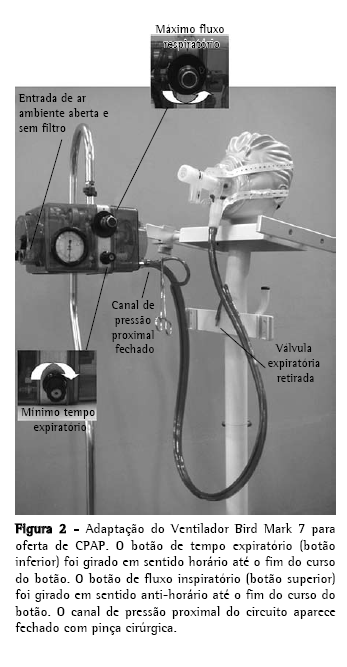 Para adaptar e otimizar o ventilador para aplicação de CPAP, retirou-se o nebulizador (apesar de não haver diferença de fluxo observada); ajustou-se o botão de tempo expiratório para o mínimo; o fluxo inspiratório para o máximo; abriu-se a entrada lateral de ar ambiente sem nenhum filtro, permitindo o máximo de fluxo; fechou-se o canal de pressão proximal do circuito e retirou-se a válvula expiratória (Figura 2). Então, foi testada sua eficiência nos níveis de CPAP de 5, 10 e 15 cmH2O. O ventilador Bird Mark 7 foi conectado à rede de oxigênio hospitalar através de uma válvula redutora de pressão (700810; Moriya, São Paulo, Brasil) ajustada para pressões de 400 e 500 kPa. Para cada pressão de alimentação (400 e 500 kPa) foi medido o fluxo de ar que saia do Bird Mark 7 com um analisador de calibração (RespiCal-Timeter; Allied Health Care, St. Louis, MO, EUA). A pressão de alimentação de oxigênio foi ajustada para 400 e 500 kPA porque pressões de alimentação inferiores geraram fluxos menores que 100 L/min, que são insuficientes para o modo CPAP.(10)