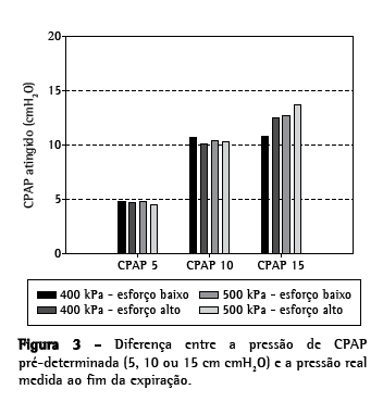 O CPAPreal para o CPAP de 5 e 10 cmH2O foi igual ao pré-determinado. Novamente, nos testes com CPAP 15 cmH2O a adaptação foi ineficiente. A pequena melhora no desempenho para atingir a pressão pré-determinada com o esforço alto provavelmente está relacionada ao maior volume inspiratório gerado e conseqüente maior volume expiratório, que pode ter proporcionado maior recuperação da pressão após a queda durante a inspiração.