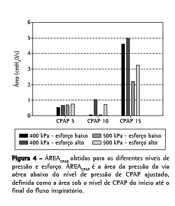 A ÁREACPAP idealmente deve ser zero, uma vez que o nível de pressão ajustado deve ser mantido constante para oferecer a melhor assistência.(11) A análise da ÁREACPAP se correlaciona com a queda do CPAP determinado, mas é mais relevante para a análise da eficiência porque, além da queda do CPAP pré-determinado, também considera o tempo que esta pressão ficou abaixo do pré-determinado durante a inspiração. A cada nível de CPAP foram analisados dois diferentes níveis de esforço inspiratório, que foram conseguidos com diferentes ajustes do ventilador de disparo. Os esforços inspiratórios foram assim definidos: