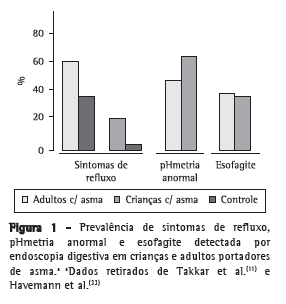 Apesar disso, não existem dúvidas de que a DRGE é frequente nos asmáticos, e isso tem sido bem demonstrado em inúmeros estudos de prevalência. Duas revisões sistemáticas recentes indicam que a prevalência de sintomas de DRGE é substancialmente maior em adultos e em crianças com asma do que em controles.(11,33) Em uma revisão de 28 estudos com adultos asmáticos, a prevalência média de sintomas de DRGE foi de 59,2%, enquanto, no grupo controle, essa foi de 38,1%. A prevalência de RGE diagnosticado por pHmetria nos asmáticos foi de 51%.(33) Em outra revisão, que incluiu 20 estudos com crianças asmáticas, a prevalência média de DRGE ajustada para a idade foi de 22,8% (Figura 1).(11)