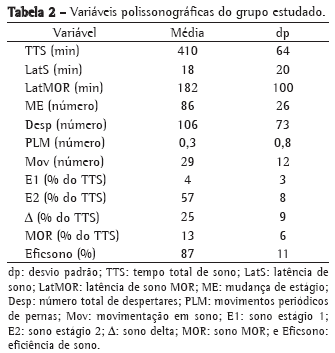 Em relação ao questionário de sono, 40 pacientes (80%) referiram roncar e 19 (38%) afirmaram haver fumantes no domicílio. Os valores médios das variáveis polissonográficas são apresentados nas Tabelas 2 e 3. No que se refere à distribuição média dos estágios do sono, observamos diminuição do estágio MOR = 13 ± 6%, aumento do estágio 2 = 57 ± 8%, ficando o restante dentro da normalidade para a idade, ou seja, estágio 1 = 4 ± 3% e sono delta = 25 ± 9%.