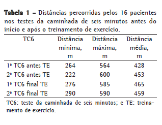 Todos os pacientes realizaram dois testes da caminhada de seis minutos antes do início e no final do período de TE. Esses foram realizados de acordo com as recomendações atuais,(12) em pista fechada de 30 m.
