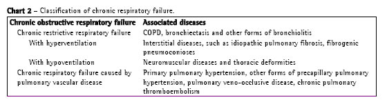 The progression of respiratory complications to chronic respiratory failure in patients with neuromuscular diseases generally occurs as a direct consequence of two principal factors: weakness/fatigue of respiratory muscles (inspiratory, expiratory and of the upper airways); and incapacity to maintain the airways free of secretions. Within a more comprehensive classification of chronic respiratory failure (Chart 2), we can characterize it as a profile of chronic restrictive respiratory failure with hypoventilation.