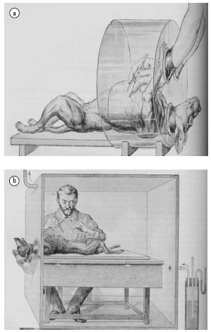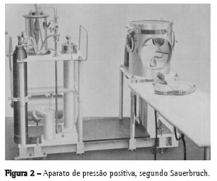O primeiro aparelho destinado a substituir a ventilação em pessoas que, por algum motivo, tinham parado de renovar o ar alveolar adequadamente, foi usado em larga escala a partir da terceira década do século XX, nos EUA. Construído por um engenheiro no Hospital da Universidade de Harvard,(2) recebeu o nome de pulmão de aço. Vivia-se, na época, uma pandemia de poliomielite, na qual morreram muitas pessoas com a forma paralítica respiratória da doença, pelo fato de não estar disponível nenhum mecanismo capaz de substituir a ventilação. A necessidade de uma máquina que conseguisse ventilar os pacientes era premente, e os conhecimentos disponíveis sobre a fisiologia respiratória, no momento, levaram à construção de um aparelho que se assemelhava à sala de Sauerbruch. Consistia de um cilindro de aço, no qual o paciente era introduzido até o pescoço, permanecendo apenas com a cabeça para fora do aparelho, e um motor elétrico, que gerava periodicamente pressões subatmosféricas dentro cilindro, e provocava a expansão da caixa torácica. Este aumento do volume do tórax fazia cair a pressão intratorácica e o ar era então aspirado para dentro das vias aéreas. Curiosamente, quando havia necessidade de se interromper temporariamente o funcionamento da máquina, colocava-se um domo transparente sobre a cabeça do paciente, no interior do qual se fazia pressão positiva. Um dispositivo semelhante de pressão positiva é descrito por Sauerbruch, em seu livro de 1922(1) (Figura 2), apesar de o autor dizer francamente que preferia a sala de pressão negativa, sua criação, por medo dos efeitos danosos da pressão positiva sobre os pulmões.