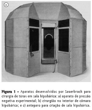Com o objetivo de contornar esta dificuldade criada pela diferença de pressão, Sauerbruch(1) desenvolveu uma sala para operar tórax (Figura 1). Nesta sua criação, o paciente a ser operado era posicionado com a cabeça para fora da sala, aos cuidados do anestesista. A equipe cirúrgica e o restante do corpo do paciente ficavam dentro da sala, onde se produzia, pela ação de bombas de sucção de ar, uma pressão mais baixa que a atmosférica em aproximadamente 7 mmHg. A comunicação entre o interior e o exterior da sala era vedada ao redor do pescoço do paciente por uma espécie de obturador móvel ajustável. A cabeça para fora da sala e a pressão subatmosférica ao redor do tórax permitiam a abertura do tórax sem colapso dos pulmões e a manutenção da ventilação espontânea.