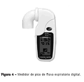 A medida do pico de fluxo da tosse pode ser feita com o auxílio de um Peak Flow Meter (Figura 4). O pico de fluxo da tosse está diretamente correlacionado à habilidade de eliminar secreções do aparelho respiratório,(20) e valores abaixo de 160 L/min estão associados à limpeza inadequada da árvore traqueobrônquica.(21,22) No entanto, valores superiores, porém muito próximos de 160 L/min não garantem necessariamente uma adequada proteção das vias aéreas, pois a força muscular tende a piorar durante episódios infecciosos.(23) Por este motivo, um valor de pico de fluxo da tosse de 270 L/min tem sido utilizado para detectar pacientes que se beneficiariam de técnicas de tosse assistida.(24)