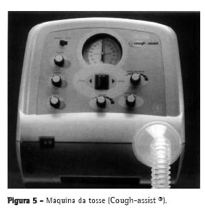 Nas situações em que a força para tossir praticamente não existe, está formalmente indicado um aparelho capaz de fazer insuflação com pressão positiva e aspiração, com pressão negativa, imediatamente após a expansão pulmonar. Este aparelho é conhecido como IN-Exsufflator ® ou Cough-assist ® (Respironics, Murrysville, PA) (Figura 5). A comparação dos picos de fluxo da tosse produzidos com estas máquinas e aqueles produzidos pela máxima insuflação e tosse assistida revela a superioridade da reprodução mecânica da tosse. Na verdade, a disponibilidade de uma destas máquinas facilita sobremaneira o cuidado de pacientes com doença neuromuscular, mesmo em fases não muito avançadas de comprometimento da força muscular respiratória.