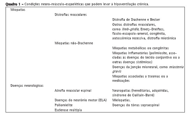 O comprometimento da força da musculatura respiratória pode ocorrer em várias doenças dos nervos e dos músculos (Quadro 1), e a perda da capacidade de ventilação acontece agudamente e de modo absoluto nos traumatismos raquimedulares cervicais. Distrofias musculares, neuropatias e doenças da placa mioneural, quando acometem a musculatura da respiração, têm outro tipo de evolução: em surtos, ou então com piora progressiva, em velocidade variável.