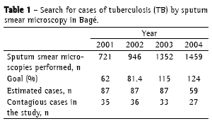 DiscussionThe goal of the PNCT is that 1% of the population of the city be investigated through direct sputum smear microscopy.(11) In Bagé, the population predicted for 2005 was 120,129 inhabitants.(14) Therefore, it was stipulated that, from 2001 to 2004, there would be 1180 sputum smear microscopy analyses (of the first sputum sample) performed annually.(11) The expected number of new cases of pulmonary TB for the 2001-2003 period was 87 per year. However, this number dropped to 59 for 2004. The goal of reaching 1% of the population was reached in 2003 and 2004(15) (Table 1).