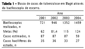 DiscussãoA meta do PNCT prevê que 1% da população do Município seja investigada através da baciloscopia direta de escarro.(11) Em Bagé, a população prevista para 2005 foi de 120.129 mil habitantes.(14) Assim sendo, de 2001 a 2004, foi estipulada a realização anual de 1.180 baciloscopias de escarro de primeira amostra.(11) O número esperado de novos casos de tuberculose pulmonar para o período de 2001 a 2003 foi de 87 para cada ano, mas já para 2004 este número diminuiu para 59 novos casos. As metas de atingir 1% da população foram atingidas em 2003 e 2004(15) (Tabela 1).