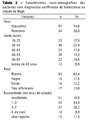 Objetivo: Realizar um levantamento epidemiológico dos pacientes com diagnóstico de tuberculose, e fatores associados, além de verificar a eficácia do Programa Nacional de Controle da Tuberculose na cidade de Bagé, Rio Grande do Sul. Métodos: Realizou-se um estudo retrospectivo dos casos notificados de tuberculose do Posto Paulo Barcellos, através da revisão de prontuários médicos e dos dados do Sistema Nacional de Agravos de Notificação, entre janeiro de 2001 e dezembro de 2004. Resultados: Neste período, foram realizadas 4.468 baciloscopias, sendo a de escarro a amostra mais numerosa. Resultaram positivas 131 amostras, com prevalência maior do sexo masculino e idade entre 26 e 35 anos, e prevalência menor daqueles com idade acima de 65 anos. Mais de 50% dos pacientes eram da raça branca, tinham apenas 1 a 3 anos de estudo, e exerciam alguma função que lhes garantia algum sustento, com renda mensal baixa (média de 265 reais/mês). Houve equivalência entre os fumantes e não fumantes, e somente um dos 131 casos de tuberculose era HIV positivo. Conclusão: O número de baciloscopias realizadas em Bagé foi crescente nos últimos quatro anos. Em 2003 e 2004, esse número superou as metas do Programa Nacional de Controle da Tuberculose, o que demonstra a eficácia da busca ativa de casos de tuberculose na cidade, no entanto, houve diminuição de casos novos.