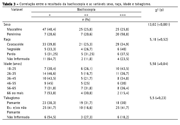 Quando analisada a associação entre sexo e resultado da baciloscopia, comprovou-se que 58,8% dos casos do sexo feminino e 25,8% do sexo masculino tiveram '+++' (p < 0,001) como resultado deste exame (Tabela 3). Referente ao endocruzamento entre a raça e o exame acima, 34,9% dos caucasóides, 40% dos negróides e 37,5% dos pardos apresentaram resultado '+++' (p = 0,52) (Tabela 3). No que tange à correlação entre a idade e a baciloscopia, descobriu-se que 43,5% dos casos entre 18 e 25 anos; 36,7% entre 26 e 35; 34,8% entre 36 e 45; 29,30% entre 46 e 55; 36,4% entre 56 e 65, e 15,4% com 66 anos ou mais apresentaram resultado '+++' (p = 0,84) (Tabela 3). Com relação ao cruzamento entre tabagismo e baciloscopia, foi verificado que 30% dos fumantes e 41,7% dos ex- e/ou não fumantes mostraram resultado '+++' (p = 0,23) (Tabela 3).