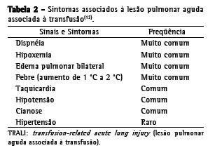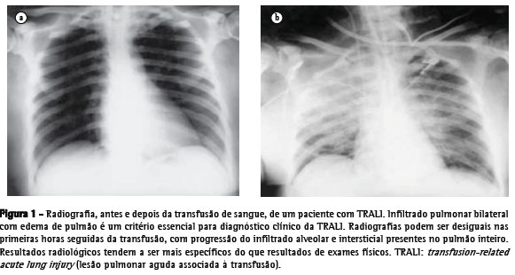 A lesão pulmonar aguda associada à transfusão (transfusion-related acute lung injury, TRALI) foi reconhecida como entidade clínica em 1985.(1) Embora não haja consenso definitivo, a TRALI é considerada uma séria complicação relacionada à transfusão de hemocomponentes que contêm plasma. É caracterizada por insuficiência respiratória aguda, edema pulmonar bilateral e severa hipoxemia, sem comprometimento cardíaco, ocorrendo durante ou dentro de 6 h, após completada a transfusão.(2,3)
