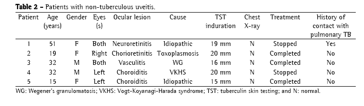 Of the 5 patients with a final diagnosis of non-TBU, 3 presented posterior uveitis (idiopathic neuroretinitis, idiopathic choroiditis, and toxoplasmic retinochoroiditis) and 2 presented diffuse uveitis (Vogt-Koyanagi-Harada syndrome and Wegener's granulomatosis, respectively), the disease being unilateral in 3 cases and bilateral in 2 (Table2). The average TST induration was 18 ±2.35 mm. Of the same 5 patients, 3 had received anti-TB drugs for up to 3 months, without any clinical improvement, and 2 had completed the treatment but had presented reactivation of the uveitis during the follow-up period. In the case diagnosed as toxoplasmic retinochoroiditis, the diagnosis was delayed, since the patient had initially been treated for toxoplasmosis, with no improvement, was subsequently treated for TBU, still with no improvement, and was finally treated successfully for toxoplasmosis (healed lesion). A history of contact with pulmonary TB was reported only by the patient presenting clinical features consistent with Vogt-Koyanagi-Harada syndrome, who, although presenting signs of late manifestations during re-examination, healed satisfactorily. The patient diagnosed with Wegener's granulomatosis underwent enucleation of one eye due to subsequent scleritis that caused retinal detachment and a painful blind eye (confirmed through histopathological examination). That patient responded well to pulse therapy and systemic corticosteroids. The 2 remaining non-TBU patients (those diagnosed with idiopathic neuroretinitis and idiopathic choroiditis, respectively) presented intermittent disease and were treated with oral corticosteroids during flare-ups.