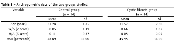 A total of 28 children were evaluated (10 females and 18 males), 14 in each group. In the cystic fibrosis group, the mean age was 11.57 ± 2.50 years, ranging from 8 to 15 years, and 9 of the children were above the age of 10. In the control group, the mean age was 11.28 ± 1.85 years, ranging from 9 to 14 years, and 9 of the children were above the age of 10. There were no differences between the groups regarding the anthropometric data (Table 1).