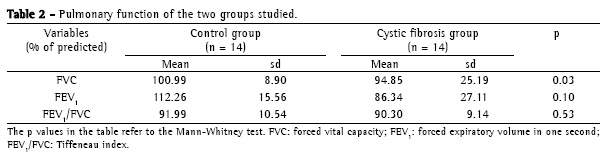 Mean FVC was lower in the cystic fibrosis group than in the control group, and this difference was statistically significant (p = 0.03). However, mean values were within the limits of normality (Table 2).