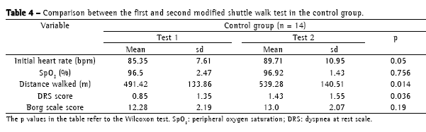 The Wilcoxon test was used in order to compare the reproducibility of the MSWT in each of the groups studied. The variables analyzed were the same as those used in the comparison between the groups, plus the dyspnea at rest scale. The level of significance was set at 5% (p < 0.05).