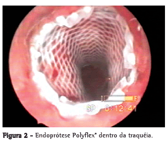 Atualmente, vários modelos estão disponíveis, dividindo-se em dois grupos: endopróteses de silicone rígido e endopróteses metálicas auto-expansíveis.(2) A endoprótese de silicone mais utilizada é a de Dumon, um dispositivo cilíndrico com a superfície externa apresentando protuberâncias que permitem melhor fixação à mucosa da traquéia.(4-6) Suas vantagens são a baixa reatividade e facilidade de remoção.(5) Porém, apresenta como desvantagens o comprometimento do clareamento muco-ciliar, a aplicação difícil em algumas situações, exigindo a utilização de aparatos especialmente desenhados para sua inserção e posicionamento, a migração relativamente freqüente, especialmente em estenoses cônicas ou associadas à traqueomalácia e a relação desfavorável entre os diâmetros externo e interno da endoprótese, podendo provocar resistência indesejável ao fluxo aéreo.(5,6) Apesar das desvantagens descritas, essas endopróteses vêm sendo utilizadas em larga escala e com bons resultados na literatura.(5-8) As endopróteses metálicas auto-expansíveis mais utilizadas são Wallstent® e Ultraflex®. Essas endopróteses são de fácil inserção, acomodando-se adequadamente à superfície irregular da traquéia estenótica, mas causam reação inflamatória local e formação de tecido de granulação que infiltra a malha da endoprótese podendo causar obstrução de sua luz.(9-11) Sua remoção é difícil, podendo causar complicações graves como sangramento profuso.(12,13)