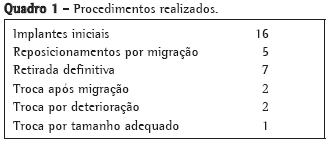 ResultadosUm total de 33 procedimentos endoscópicos, seja para implante, revisão ou retirada das endopróteses (Quadro 1), foram realizados em centro cirúrgico durante o seguimento médio de 7,45 meses (intervalo de 2 a 18 meses), compreendendo o período do estudo. Em nenhum dos casos houve complicações intra-operatórias ou óbitos relacionados à prótese ou aos procedimentos. Em apenas um dos implantes uma paciente asmática grave teve broncoespasmo e precisou permanecer 12 h em observação em terapia intensiva. Nos demais casos, os pacientes foram encaminhados para a enfermaria após período de observação de cerca de 2 h.