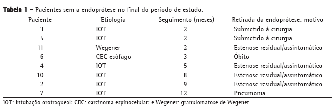 Durante a evolução, sete pacientes foram submetidos à retirada definitiva da endoprótese, seja por terem sido operados (dois casos), seja por permanecerem com estenose estável e assintomática (quatro casos), ou por quadro infeccioso, necessitando de traqueostomia (um caso). Os quatro pacientes que permaneceram com estenose estável e assintomática apresentaram estenose residual pouco significativa e de aspecto fibrótico à broncoscopia, O maior tempo de seguimento pós-retirada da prótese casos foi meses. Em todos os procedimentos a prótese foi retirada sem dificuldades por tração com duas pinças endoscópicas. Um paciente com neoplasia de esôfago foi a óbito três meses após a implantação da endoprótese, devido a complicações relacionadas à doença de base (Tabela 1).