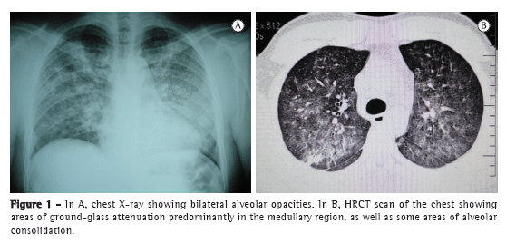 The patient was a 29-year-old White male who was married and worked as a driver. He had been born and raised in the city of Santa Maria, Brazil. This previously healthy individual presented with a five-month history of fatigue and dyspnea on moderate exertion, accompanied by weight loss (4 kg), for which he sought no medical attention. In the fifteen-day period prior to hospital admission, the patient experienced worsening dyspnea, accompanied by persistent dry cough. He reported no other symptoms. He was in good general health, had normal weight, was lucid, was oriented, was coherent, had moist and discolored mucous membranes (3+/4+), had no jaundice or cyanosis, and breathed normally. His vital signs were within normal limits, and his SpO2 was 98% on room air. Cardiopulmonary, neurological, and abdominal examination revealed no abnormalities. He had no skin lesions, joint lesions, peripheral edema, or digital clubbing.