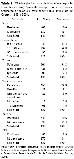 A tuberculose (TB) destaca-se por sua magnitude, constituindo-se um sério problema de saúde pública no mundo atual. Segundo estimativa da Organização Mundial de Saúde (OMS), um terço da população mundial está infectada pelo bacilo da TB. A taxa de crescimento da incidência da TB entre 1997 e 1999 foi de 6% ao ano. Em 2002, cerca de 80% dos casos novos concentravam-se em 22 países, entre eles o Brasil. Neste grupo, a Índia ocupa a 1ª posição, com 1.856.000 casos novos, e o Brasil, a 15ª, com aproximadamente 116.000.(1) No ano de 2003, o coeficiente de incidência de TB de todas as formas, para o país, foi de 40,76 por 100.000 habitantes, com 72.949 casos novos. Na região Centro-Oeste, que concentra 6,9% da população brasileira, a taxa incidência foi de 27,11 por 100.000 habitantes, com 3.394 casos diagnosticados. Em Mato Grosso, no mesmo ano, foram notificados 1.065 casos novos, redundando em um coeficiente de incidência de 39,52 por 100.000 habitantes.(2)