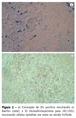 Microscopicamente, havia uma reação inflamatória intensa, com acúmulo de granulomas formados por células gigantes ao redor de áreas de necrose caseosa, com um anel de células epitelióides e linfócitos. A coloração de Ziehl-Neelsen (ZN) para Bacilos Álcool Ácido Resistentes (BAAR) foi positiva no tecido examinado e, portanto, foi feito o diagnóstico final de TB (Figura 2a). Não foram realizados testes de reação de polimerase em cadeia na hora da cirurgia. Devido à alta incidência de TB em nosso meio, somente o exame microscópico aliado à coloração de ZN positiva para BAAR é suficiente para o diagnóstico. O fundo do tecido era formado por um tecido linfóide, com áreas que lembravam corpúsculos de Hassal. A reação imunohistoquímica para AE1/AE3 mostrou que essas áreas eram epiteliais, confirmando o diagnóstico de timo (Figura 2b).