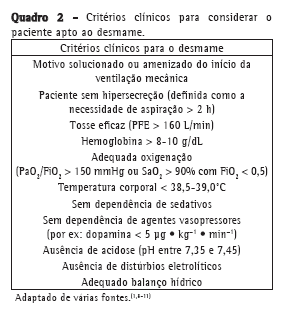 O paciente apto ao DVM deve apresentar ao menos os seguintes critérios: resolução ou estabilização da doença de base, adequada troca gasosa, estabilidade hemodinâmica e capacidade de respirar espontaneamente.(21) Preenchendo esses critérios, é recomendado que o TRE seja realizado.(1,7,8) Se a avaliação clínica não é favorável, os índices de DVM não apresentam utilidade.(22) Não há sentido em mensurar os parâmetros preditivos para o DVM caso o motivo de instituição da ventilação não tenha sido ao menos amenizado. No entanto, quando a avaliação clínica é favorável e os índices mostram um prognóstico positivo, as chances de sucesso são maiores.(22) A avaliação clínica isolada não prediz de forma acurada o resultado do DVM,(6,10) apresentando VPP e VPN de apenas 50% e 67%, respectivamente.(6,23) A avaliação clínica isolada não inclui a análise da mecânica respiratória, da demanda ventilatória e da força muscular respiratória, que são critérios importantes, sobretudo quando avaliados em conjunto. Os índices de DVM auxiliam na tomada de decisão em pacientes com risco elevado de falha.(7) Um determinado índice pode não ser muito acurado, mas em casos de valores extremamente desfavoráveis (por exemplo, PImáx > −15 ou −10 cmH2O), geralmente esse tem sua acurácia elevada. Os índices ainda são úteis em guiar a avaliação e o tratamento dos pacientes que falharam no DVM, identificando as causas de intolerância.(7) Mesmo que o fato de se completar o TRE possa predizer 85% da chance de sucesso no DVM,(6) aproximadamente 15% dos pacientes não toleram as 48 h após a extubação. Em um estudo,(24) a falha de extubação ocorreu em 121 dos 900 pacientes (13,4%) que completaram o TRE. Os critérios clínicos para avaliar se o paciente se encontra pronto para o DVM estão descritos no Quadro 2.