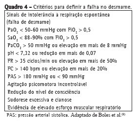 11. Goldwasser R, Farias A, Freitas EE, Saddy F, Amado V, Okamoto V. Desmame e interrupção da ventilação mecânica. In: Carvalho CR, coordinator. III Congresso Brasileiro de Ventilação Mecânica. J Bras Pneumol. 2007;33(Suppl 2S):S128-S136.