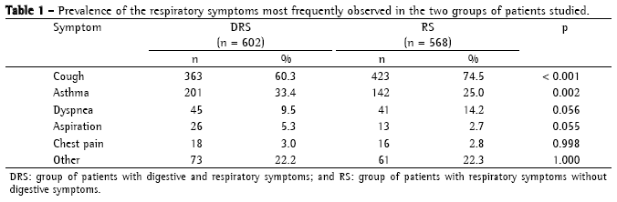 ResultsBetween January of 1995 and December of 2005, we conducted 4,020 esophageal manometry tests and 3,486 pH-metry tests. For this study, 1,170 patients met the inclusion criteria. Of those, 568 (48.5%) presented respiratory symptoms without digestive symptoms (RS group), whereas 602 (51.5%) reported digestive symptoms associated with respiratory symptoms (DRS group). Of the 309 male patients, 152 (26.4%) were in the RS group and 157 (26.8%) were in the DRS group. Of the 861 (73.6%) female patients, 416 (73.2%) were in the RS group and 445 (73.9%) were in the DRS group. The distribution by gender was homogeneous between the two groups. The clinical symptoms that led the patients to be referred for functional evaluation of the esophagus are described in Table 1. Cough and asthma were the most common respiratory symptoms among the patients in both groups. Other symptoms included recurrent pneumonia, lung abscess, bronchiectasis, chronic obstructive pulmonary disease, pulmonary fibrosis, and sleep apnea.