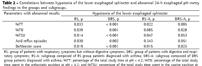 Therefore, the correlation between LES hypotonia and abnormal pH-metry test results was analyzed. In the RS and DRS groups, significant correlations were found for all such parameters. In the same comparison carried out among those who reported asthma, the correlation between hypotonia and time of exposure to acid in the supine position was found to be significant in the RS-A subgroup, which elevated to equally significant levels the percentage of the total time spent in exposure, as well as the DeMeester score. In the DRS-A group, reflux in the orthostatic position contributed significantly to elevating the total reflux time and, consequently, to elevating the final DeMeester score (Table 4). The use of bronchodilators apparently plays no role in these findings, since it has been demonstrated that there is no appreciable modification in the tonus of the LES,(29) and the that presence of the reflux does not depend on the use of bronchodilators.(30)