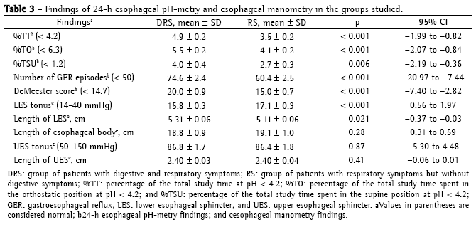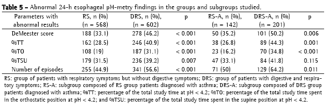 The comparison between the DRS and RS groups showed highly significant differences in all aspects of the pH-metry. However, the comparison between the DRS-A and RS-A subgroups showed significant differences only in the percentages of time with reflux in the orthostatic position, in the total time of exposure of the distal esophagus to acid and in the number of episodes of reflux in 24 h. Nevertheless, it is important to observe that all the means of the pH-metry parameters of the patients with associated digestive symptoms, either in the DRS group or in the DRS-A subgroup, presented higher values than those of the RS group, regardless of whether they were within the range of normality or not. The individuals with accompanying digestive symptoms presented greater exposure of the distal esophagus to acid.