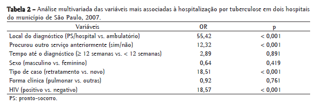 A Tabela 2 mostra os resultados da análise multivariada, pela qual se verifica uma associação entre internação por tuberculose e as seguintes variáveis: casos descobertos em hospital e/ou pronto socorro (OR = 55,42), coinfecção por HIV (OR = 18,57), casos de retratamento (OR = 18,51) e procura de outro serviço anteriormente devido à tuberculose (OR = 12,32).