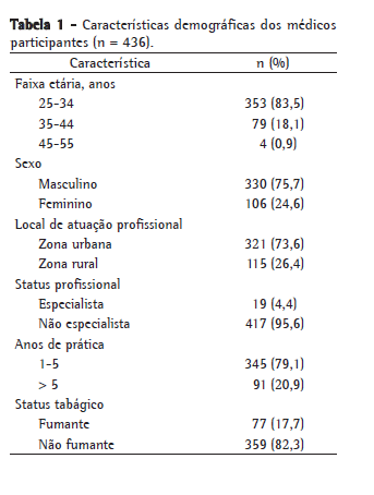 ResultadosDos 450 médicos contatados, 436 preencheram o questionário, o que significou um índice de resposta de 96,9%. A idade média dos médicos foi 30,6 ± 4,1 anos. O número médio de anos exercendo a profissão foi 3,5 ± 2,7. Dos médicos participantes, 330 (75,7%) eram homens e 106 (24,3%) eram mulheres. A Tabela 1 mostra as características dos médicos participantes. O escore médio de conhecimento sobre o uso de tabaco foi 3,3 ± 0,7 (moda, 3). Os respondentes que obtiveram pontuação ≥ 3 foram considerados com um bom nível de conhecimento sobre o uso de tabaco. Quando o escore foi estratificado em duas variáveis dicotômicas (escore bom e escore ruim), observou-se que 388 médicos (89,0%) tinham um bom nível de conhecimento sobre o uso de tabaco e que 48 (11,0%) tinham um baixo nível de conhecimento (χ2 = 265; grau de liberdade = 1; p ≤ 0,001). Duzentos e noventa e dois médicos (67,0%) estavam informados a respeito do tratamento para a cessação do tabagismo, e 136 (31,2%) não estavam informados a esse respeito (p < 0,001). Apenas 132 médicos (30,3%) tinham um bom nível de conhecimento sobre o tratamento para cessação do tabagismo, enquanto que 300 (68,8%) não tinham tal conhecimento (p < 0,001). As fontes mais comuns de informações atuais sobre a cessação do tabagismo eram as faculdades de medicina, totalizando 144 (33,0%). Trezentos e oito respondentes (70,6%) relataram que a educação sobre tabagismo nos currículos de medicina era inadequada, enquanto que 68 (15,6%) acreditavam que tal conteúdo era adequadamente incorporado aos currículos de medicina. Trezentos e setenta e seis médicos (86,2%) questionavam seus pacientes quanto ao tabagismo; 172 (39,4%) questionavam seus pacientes quanto aos motivos para o fumo. Duzentos e sessenta e oito médicos (61.5%) aconselhavam brevemente seus pacientes quanto à cessação do tabagismo. Sessenta e cinco médicos (14,9%) estabeleciam uma data para a cessação do tabagismo com seus pacientes. Dezesseis médicos (3,7%) prescreviam antidepressivos orais, ao passo que 12 (2,8%) prescreviam terapia de reposição nicotínica (TRN, goma de mascar com nicotina em todos os casos).