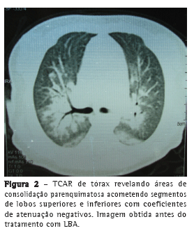 Na segunda broncoscopia, havia secreção opalescente difusa em pequena quantidade. Foi realizada LBA em lobo inferior esquerdo, cuja análise demonstrou numerosas células com inclusão de lipídeos e raras estruturas sugestivas de gotículas de gordura. No terceiro procedimento, a LBA foi realizada no lobo superior direito. Também havia estruturas sugestivas de gotículas de gordura e numerosas células com inclusão de lipídeos.