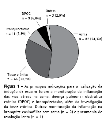 A análise do escarro induzido também permitiu o reconhecimento da bronquite eosinofílica não-asmática como uma causa tratável de tosse crônica.(11) Assim, a aferição da inflamação das vias aéreas passa a ser uma importante ferramenta recentemente adicionada ao algoritmo de investigação da tosse crônica.(12,13) Em relação à aplicabilidade na DPOC, em um estudo randomizado recentemente publicado,(14) observou-se uma redução significativa do número de exacerbações graves e admissões hospitalares no grupo tratado com base nos achados do escarro induzido, em comparação ao grupo tratado com base no consenso da British Thoracic Society.