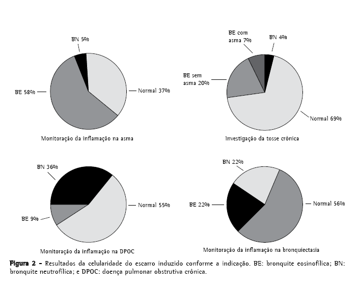 A Figura 2 mostra a proporção dos resultados da análise da celularidade do escarro induzido, em cada grupo de indicação do teste. Freqüências variáveis de bronquite eosinofílica, bronquite neutrofílica e celularidade normal foram observadas em cada grupo.